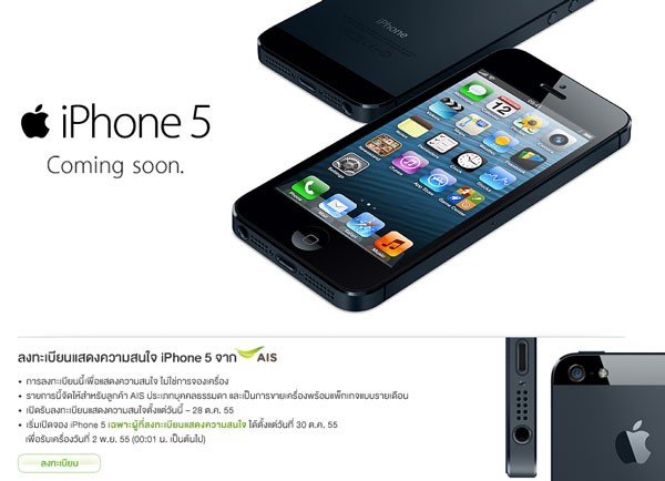 - เริ่มเปิดจอง iPhone 5 เฉพาะผู้ที่ลงทะเบียนแสดงความสนใจ ได้ตั้งแต่วันที่ 30 ต.ค. 55 เพื่อรับเครื่องวันที่ 2 พ.ย.55 (00.01 น. เป็นต้นไป)