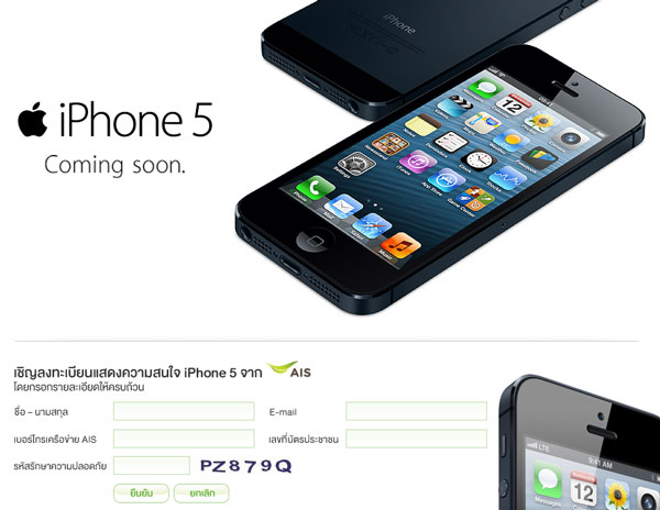 ในฝั่งของ AIS นั้น ขณะนี้ เป็นแค่การเปิดให้ลงทะเบียนแสดงความสนใจเท่านั้น โดยผู้ที่เข้าลงชื่อแสดงความสนใจ จะได้รับข่าวสารเกี่ยวกับ iPhone 5 แบบอัพเดทจากทาง AIS นั่นเอง โดยรายละเอียดของการลงทะเบียนแสดงความสนใจ เป็นดังนี้