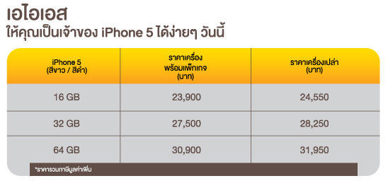 - iPhone 5 64GB เครื่องเปล่า 31,950 บาท เครื่องพร้อมแพ็กเกจ 30,900 บาท