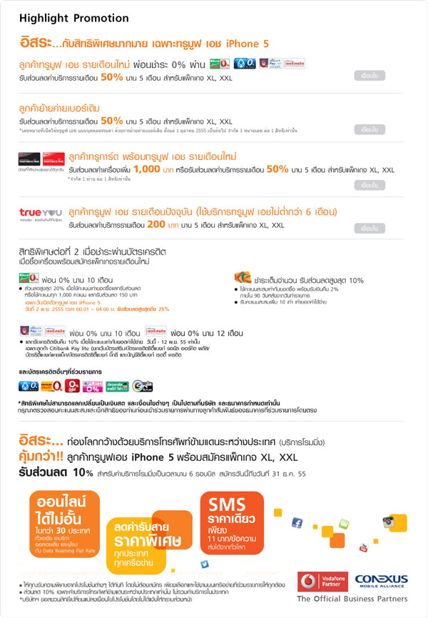 นอกจากนี้ ยังมีรายละเอียดโปรโมชั่น iPhone 5 อื่นๆ จากทาง Truemove H ทั้งการผ่อนชำระ 0% ผ่านบัตรเครดิตที่ร่วมรายการ, ลูกค้าทรูการ์ด รับส่วนลดเครื่อง 1,000 บาท หรือรับส่วนลดค่าบริการรายเดือน 50% ซึ่งมีรายละเอียดเป็นดังนี้