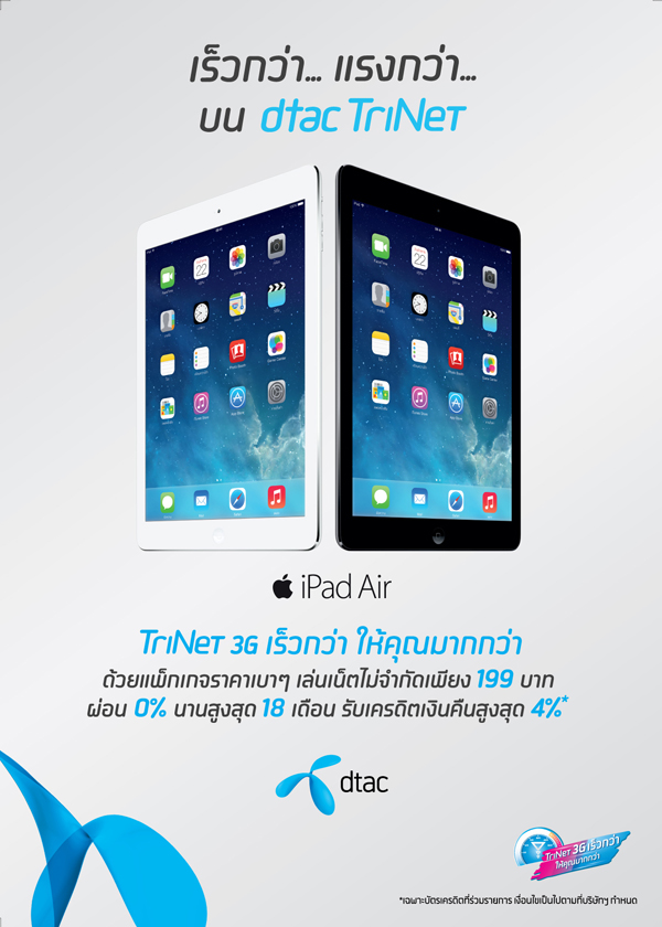 2 ธันวาคม 2553 ดีแทควางจำหน่าย dtac iPad Air พร้อมกันทั่วประเทศแล้ววันนี้ และเตรียมวางจำหน่าย dtac iPad Mini หน้าจอเรติน่า ในวันที่ 4 ธันวาคม 2556 กับหลากหลายแพ็กเกจดีแทคอินเทอร์เน็ตสุดคุ้ม ให้ผู้บริโภคได้เพลิดเพลินอย่างเต็มที่กับประสบการณ์สื่อสารที่รวดเร็วกว่า บน TriNet - 3 โครงข่ายอัจฉริยะบนแบนด์วิธที่กว้างที่สุดจากดีแทค พร้อมสิทธิพิเศษอีกมากมาย รวมถึงแคมเปญพิเศษ ยิ่งอยู่นาน ยิ่งรักกัน ที่ให้ลูกค้าดีแทคนำอายุการใช้งานมาเป็นส่วนลดค่าเครื่องได้สูงสุดถึง 2,400 บาท