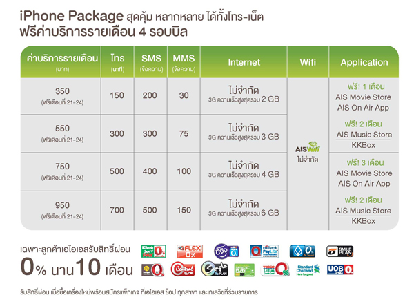 นอกจากนี้ เอไอเอสยังจำหน่าย iPhone 5S ในราคาเครื่องพร้อมแพ็กเกจและสิทธิพิเศษผ่อน 0% นาน 10 เดือน โดย 16GB ราคา 2,010 บาท / เดือน , 32GB ราคา 2,200 บาท / เดือน และ 64GB ราคา 2,430 บาท / เดือนด้วย สอบถามรายละเอียดเพิ่มเติมได้ที่เอไอเอส คอลล์ เซ็นเตอร์ 1175 หรือดูรายละเอียดเพิ่มเติมได้ที่ www.ais.co.th/iphone6 และ www.apple.com/iphone