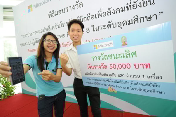กรุงเทพฯ 11 พฤศจิกายน 2557 ไมโครซอฟท์ ดีไวซ์ ประเทศไทย จับมือจุฬาลงกรณ์มหาวิทยาลัย มอบรางวัล การประกวดแอพพลิเคชั่นเพื่อสังคมที่ยั่งยืนบนระบบปฏิบัติการ Windows Phone ในระดับอุดมศึกษา ภายใต้โครงการจุฬาฯ รักษ์โลก โดยเปิดโอกาสให้เยาวชนได้ใช้ความคิดสร้างสรรค์ในการพัฒนาแอพพลิเคชั่นบนสมาร์ทโฟนที่เป็นประโยชน์ต่อสังคมในมิติต่างๆ ไม่ว่าจะเป็นสังคม สุขภาพ หรือสิ่งแวดล้อม หวังเพิ่มนักพัฒนารุ่นใหม่สู่อุตสาหกรรมแอพพลิเคชั่นไทย พร้อมกระตุ้นให้เกิดแอพพลิเคชั่นความหลากหลายเพื่อผู้บริโภค
