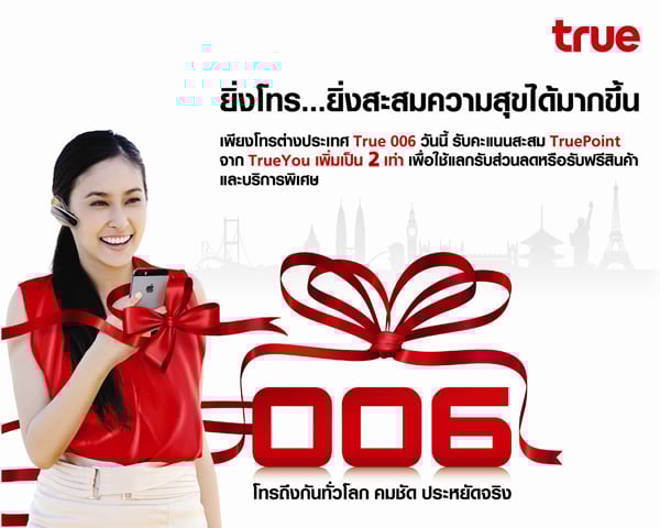 ทรู 006 จัดแคมเปญขอบคุณลูกค้า รับคะแนนสะสม TruePoint เพิ่มเป็น 2 เท่า เมื่อโทรทางไกลต่างประเทศผ่าน 006 ตั้งแต่ 1 เม.ย. 30 ก.ย. นี้