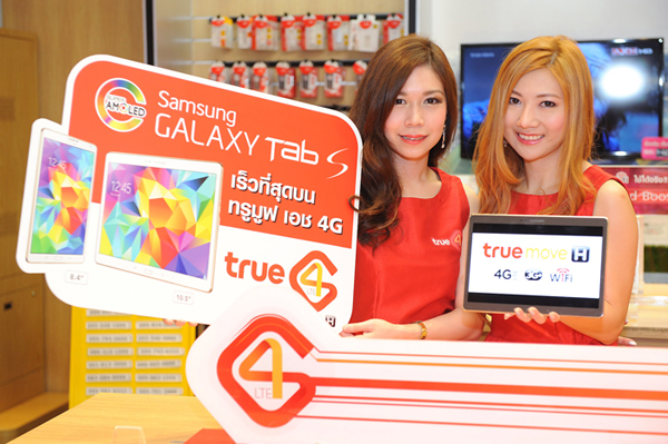 กรุงเทพฯ 3 กรกฎาคม 2557 ทรูมูฟ เอช โดย ดร.กิตติณัฐ ทีคะวรรณ ผู้อำนวยการ ธุรกิจรีเทล บมจ. ทรู คอร์ปอเรชั่น และ ซัมซุง โดย คุณวิชัย พรพระตั้ง รองประธานธุรกิจโทรคมนาคมและไอที บริษัท ไทยซัมซุง อิเลคโทรนิคส์ จำกัด จับมือประกาศพร้อมจำหน่าย Samsung Galaxy Tab S สุดยอด Tablet สุดพรีเมียมแห่งปีของค่ายซัมซุง อย่างเป็นทางการ 4 ก.ค.นี้ที่ทรูสโตร์ และทรูช้อปทั่วประเทศ พิเศษเหนือระดับให้ลูกค้าได้สัมผัสที่สุดแห่งเทคโนโลยีของ Galaxy Tab S บนเครือข่ายความเร็ว 4G จากทรูมูฟ เอช ที่ครอบคลุมที่หนึ่งทั่วกรุงเทพฯ ปริมณฑล และ 14 จังหวัดทั่วไทย และเครือข่าย 3G ครอบคลุมที่ 1 ทั่วไทย กับข้อเสนอสุดคุ้ม Samsung Galaxy Package สำหรับลูกค้าที่ซื้อ Samsung Galaxy Tab S พร้อมเปิดเบอร์ใหม่หรือย้ายค่ายเบอร์เดิม ด้วยส่วนลดค่าบริการรายเดือน 50% นานถึง 2 ปี โทรฟรี 24 ชั่วโมง อินเตอร์เน็ต 4G ฟรีเริ่มต้น 2GB ทุกแพ็กเกจ ทุกเดือน และเอาใจกลุ่มลูกค้าที่รักการเล่นโซเชียล เน็ตเวิร์ค ด้วยการให้คุณเล่น Facebook, LINE, WhatsApp, Gmail และ MyLife ฟรีไม่อั้นนาน 1 ปีเต็ม พร้อมชม TrueVisions Anywhere ฟรีสูงสุดเดือนละ 1GB นาน 1 ปี