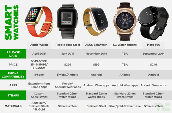 เปิดตัวรอบที่สองไปแล้วเมื่อช่วงค่ำคืนที่ผ่านมา สำหรับ Apple Watch นาฬิกาอัจฉริยะจาก แอปเปิล ที่ได้มีการเผยราคาออกมาอย่างเป็นทางการแล้วเช่นกัน โดย ราคา Apple Watch นั้น เริ่มต้นที่ $349 หรือประมาณ 12,000 บาท แน่นอนว่า สูงกว่า Smart Watch รุ่นอื่นในท้องตลาดมากเลยทีเดียว ด้วยเหตุนี้ เว็บไซต์ techcrunch จึงได้มีการเปรียบเทียบว่า ด้วยราคาเปิดตัวที่สูงขนาดนี้ Apple Watch จะมีจุดเด่นอะไรที่สามารถ สู้คู่แข่ง อย่างเช่น Pebble Time Steel, Asus ZenWatch, LG Watch Urbane และ Moto 360 ได้บ้าง ลองมาดูตารางเปรียบเทียบกันครับ