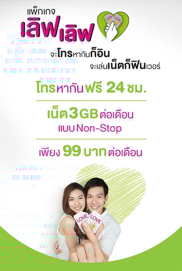 แพ็กเกจเลิฟเลิฟ แพ็กเกจสุดคุ้มสำหรับคนมีคู่ทุกรูปแบบ ฟรีทั้งค่าโทร และอินเทอร์เน็ตนานสูงสุด 1 ปีเต็ม