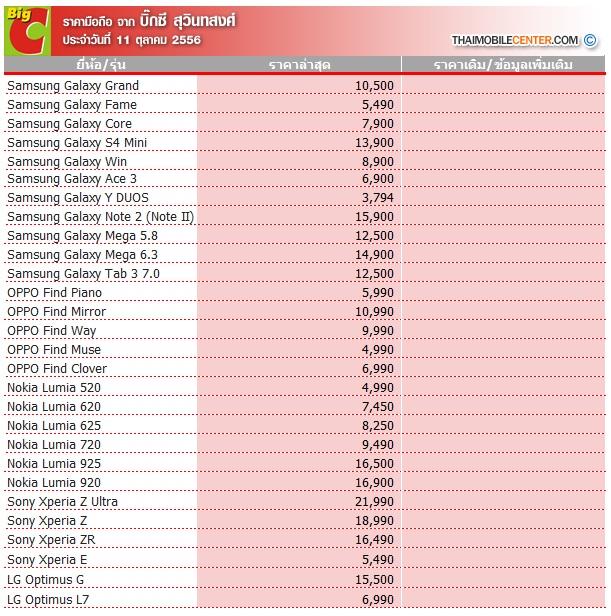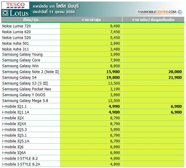 สวัสดีครับ หลังจากที่งาน Thailand Mobile Expo 2013 Showcase ได้ปิดฉากลงไป ก็น่าจะมี สมาร์ทโฟน รุ่นใหม่หลายๆ รุ่นที่วางจำหน่ายเป็นครั้งแรกในงานนี้ เริ่มทยอยวางจำหน่ายในห้างโลตัส และบิ๊กซี ด้วยเช่นกัน ยกตัวอย่างเช่น OPPO Find Way S ซึ่งวางจำหน่ายครั้งแรกที่งาน Thailand Mobile Expo 2013 Showcase ที่ผ่านมา และทาง OPPO เคาะราคา OPPO Find Way S ออกมาที่ 12,990 บาท โดย OPPO Find Way S จะมาพร้อมกับจอแสดงแบบ IPS ขนาด 5 นิ้ว ความละเอียดระดับ HD (1280×720 พิกเซล) และใช้ซีพียูระดับ Quad-Core เป็นขุมพลังในการขับเคลื่อน พร้อมด้วยกล้องดิจิตอลตัวหลักที่ด้านหลังของตัวเครื่อง ความละเอียด 8 ล้านพิกเซล และกล้องดิจิตอลขนาดเล็กที่ด้านหน้าของตัวเครื่อง ความละเอียด 5 ล้านพิกเซล ที่สำคัญ ยังมากับฟังก์ชัน Beauty Plus เวอร์ชัน 3.0 และฟังก์ชัน Cosmetic สำหรับตกแต่งภาพ และยังใช้ระบบปฎิบัติการแอนดรอยด์เวอร์ชัน 4.2.1 (Jelly Bean) พร้อมรองรับการใช้งานถึง 2 ซิมการ์ดอีกด้วย กลับมาที่ราคา HyperMarket กันบ้าง โดยการสำรวจราคาครั้งนี้จะเป็นการสำรวจราคามือถือที่ โลตัส สาขามีนบุรี และบิ๊กซี สาขาสุวินทวงศ์ จากการสำรวจพบว่าสมาร์ทโฟนที่เคยเป็นรุ่นไฮไลท์อย่าง Samsung Galaxy Note II และ Samsung Galaxy S III หรือ Nokia Lumia 620 และ Nokia Lumia 720 ได้มีการปรับราคาลดลงกว่าเดิมมาก และไม่เพียงเท่านั้น ยังมีรุ่นอื่นๆ ที่ยังมีการปรับราคาลงเช่นเดียวกัน ส่วนจะมีรุ่นอะไรบ้างนั้น ไปชมพร้อมกันได้เลย ราคามือถือ จาก โลตัส (มีนบุรี) ประจำวันที่ 11 ตุลาคม 2556  บรรยากาศหน้าห้างโลตัส สาขามีนบุรี : แผนที่
