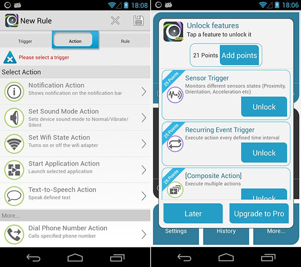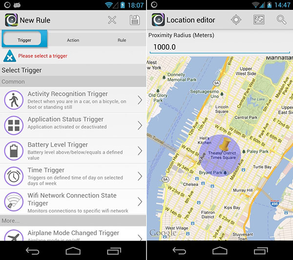 วิธีการทำงานของ AutomateIt อาศัยหลักการ If this then that (เมื่อเกิดเหตุการณ์แบบนี้ ให้ทำแบบนั้น) ตัวอย่างเช่นเราสร้างกฎ (Rule) ว่า เมื่อถึงเวลา 4 ทุ่ม ให้ เข้าโหมดปิดเสียง เมื่อเราตั้ง Rule เอาไว้แบบนี้ พอถึงเวลา 4 ทุ่ม แอพ AutomateIt ก็จะสั่งให้อุปกรณ์เข้าโหมดปิดเสียงโดยอัตโนมัติ โดยที่เหตุการณ์ตั้งต้น อาทิ เมื่อถึงเวลา 4 ทุ่ม นั้นถูกเรียกว่า Trigger (ตัวกระตุ้น) และการสั่งงานที่จะเกิดขึ้นสืบเนื่องจากเหตุการณ์ตั้งตัน อาทิ เข้าโหมดปิดเสียงนั้นถูกเรียกว่า Action จากคอนเซ็ปต์ที่อธิบายไปข้างต้นอาจดูเหมือนว่า AutomateIt เป็นแอพที่ใช้งานยาก แต่หากใครได้ลองใช้งานจริงจะพบว่าเป็นแอพที่ใช้งานง่าย และสามารถนำไปประยุกต์ใช้ได้หลายรูปแบบ ขึ้นอยู่กับความคิดสร้างสรรค์ของคุณ และเป็นแอพที่น่าสนุกมาก โดยในแอพ AutomateIt นั้นมี Trigger และ Action หลายรูปแบบ ทำให้สามารถสร้าง Rule ได้หลากหลายครอบคลุมทุกความต้องการของผู้ใช้งาน ดังตัวอย่างเช่น 1. เอา Trigger Time (เวลา) + Action Set Sound Mode (การปรับโหมดเสียง) ก็จะได้ Rule ที่สั่งให้สมาร์ทโฟนเข้าโหมดปิดเสียง (Silent) โดยอัตโนมัติเมื่อถึงเวลาที่กำหนดไว้ 2. เอา Trigger Headset Plug State (จับสถานะการใส่-ถอดสายหูฟัง) + Action Start Application (การเรียกใช้งานแอพพลิเคชั่น) ก็จะได้ Rule ที่สามารถสั่งให้เปิดแอพเล่นเพลงโดยอัตโนมัติเมื่อเสียบสายหูฟัง 3. เอา Trigger Headset Plug State (จับสถานะการใส่-ถอดสายหูฟัง) + Action Set Volume (ปรับระดับเสียง) ก็จะได้ Rule ที่สามารถปรับระดับเสียงให้เหมาะสำหรับการฟังเพลงโดยอัตโนมัติเมื่อเสียบสายหูฟัง 4. เอา Trigger Battery Level (จับสถานะระดับแบตเตอรี่) + Action Play Sound (เล่นไฟล์เสียง หรือส่งเสียงเตือน) ก็จะได้ Rule ที่ทำให้สมาร์ทโฟนสามารถส่งเสียงเตือนเมื่อแบตเตอรี่ถูกชาร์จจนเต็ม 5. เอา Trigger Wifi Network Connection State (จับสถานะการเชื่อมต่อ-ไม่เชื่อมต่อ Wifi) + Action Set Wifi State (สั่งเปิด-ปิด WiFi ของสมาร์ทโฟน) ก็จะได้ Rule ที่ทำให้สมาร์ทโฟนสามารถปิด WiFi ได้โดยอัตโนมัติเมื่อขาดการเชื่อมต่อกับ WiFi Hotspot 6. เอา Trigger Location (การจับตำแหน่ง GPS) + Action Set Wifi State (สั่งเปิด-ปิด WiFi ของสมาร์ทโฟน) ก็จะได้ Rule ที่ทำให้สมาร์ทโฟนสามารถเปิด Wifi ได้โดยอัตโนมัติเมื่อคุณไปถึงที่ทำงาน หรือกลับถึงบ้าน 7. เอา Trigger Cell ID (การจับตำแหน่งโดยอิงจากการเชื่อมต่อกับ Cell Site) + Action Set WiFi State (สั่งเปิด-ปิด WiFi ของสมาร์ทโฟน) ก็จะได้ Rule ที่ทำให้สมาร์ทโฟนสามารถเปิด WiFi ได้โดยอัตโนมัติเมื่อคุณไปถึงที่ทำงาน หรือกลับถึงบ้าน โดยวิธีนี้เหมาะสำหรับสมาร์ทโฟนที่ไม่มี GPS หรือประสิทธิภาพในการจับสัญญาณ GPS ไม่ดีนัก โดยจะอาศัยการตรวจจับตำแหน่งจากเชื่อมต่อกับ Cell Site ของระบบโทรศัพท์มือถือแทน GPS 8. เอา Trigger Sensor (การจับสถานะจากการอ่านค่าเซ็นเซอร์ Accelerometer, Proximity หรือเซ็นเซอร์วัดระ