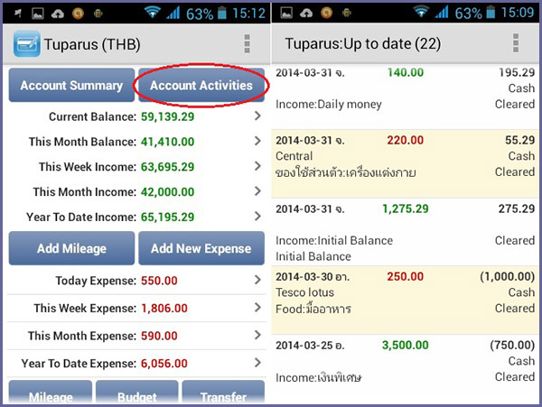 Expense Manager เป็นแอพที่ดูเหมือนว่าจะมีคอนเซ็ปต์การทำงานง่ายๆ ตรงไปตรงมา ไม่มีอะไรซับซ้อน แต่ก็มีความมหัศจรรย์ซ่อนอยู่ในตัวไม่น้อย คุณเคยรู้มาก่อนไหมว่าตั้งแต่ต้นปีจนถึงวันนี้คุณใช้เงินไปกี่บาท? ตั้งแต่ตั้นอาทิตย์จนถึงปัจจุบันคุณใช้เงินไปกี่บาท? นอกจากนี้ยังสามารถแยกแยะรายละเอียดได้ด้วยว่าคุณหมดเปลืองเงินไปกับเรื่องอะไรมากที่สุด (อาหารการกิน? แฟชั่นเครื่องแต่งกาย? การเดินทาง?) สิ่งที่คุณต้องทำคือป้อนรายละเอียดเกี่ยวกับรายรับ/รายจ่ายทุกอย่างที่เกิดขึ้นในชีวิตของคุณ โดยเมื่อคุณแตะที่ปุ่ม Account Activities ในหน้าจอหลัก [ภาพซ้าย] รายการของรายรับ/รายจ่ายทั้งหมดจะแสดงให้เห็นแบบเรียงลำดับตามวัน [ภาพขวา] ทำให้คุณย้อนรำลึกได้ว่าใช้เงินเกี่ยวกับเรื่องอะไร ไปในวันไหนบ้าง