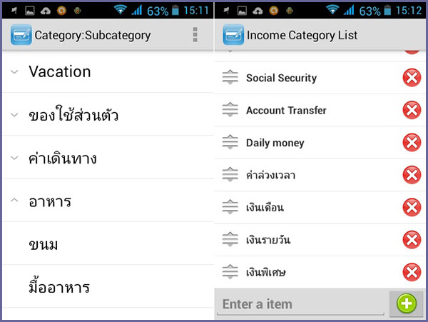 [ภาพซ้าย] การเลือกประเภทของการจ่ายเงิน (ซึ่งอยู่ในขั้นตอนการป้อนรายละเอียดของรายจ่าย ในหัวข้อที่ 2) เราสามารถสร้างประเภทของรายจ่ายหลัก (Category) ขึ้นมาใหม่ในรูปแบบของภาษาไทย เพื่อให้ง่ายต่อการทำความเข้าใจ และเรายังสามารถสร้างประเภทของรายจ่ายย่อย (Subcategory) ขึ้นมาใหม่ในรูปแบบของภาษาไทยได้ด้วย ยกตัวอย่างเช่น ประเภทของรายจากหลัก (Catagory) ค่าอาหาร ประกอบไปด้วยประเภทของรายจ่ายย่อย (Subcategory) อย่าง ค่าขนม และ ค่ามื้ออาหาร เป็นต้น ซึ่งการระบุประเภทของรายจ่ายให้ถูกต้อง มีประโยชน์มากในการสรุปผลว่าคุณจ่ายเงินให้กับเรื่องอะไรในชีวิตมากน้อยขนาดไหน