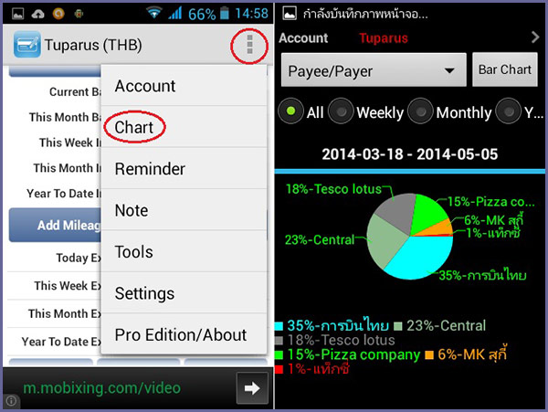 เมื่อป้อนรายจ่ายและรายได้ต่างๆ ถูกต้องครบถ้วนแล้ว ลำดับต่อมาเราจะเรียกดูกราฟสรุปผลที่มีให้เลือกดูหลายรูปแบบ เรียกดูกราฟโดยการแตะที่ปุ่ม Menu ตรงขอบจอขวาบนในหน้าจอหลัก [ภาพซ้าย] จากนั้นแตะที่คำสั่ง Chart และต่อไปนี้เป็นตัวอย่างกราฟสรุปผลที่น่าสนใจของแอพ Expense Manager มาดูกันสิว่ามันจะบอกอะไรเราได้บ้าง