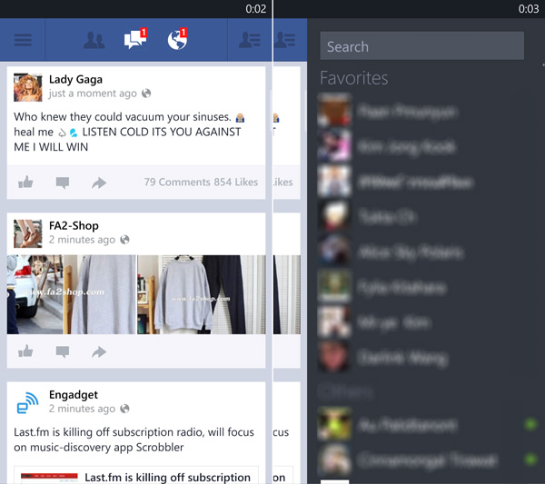 สำหรับ Facebook นั้น ถือว่า เป็นแอพพลิเคชั่นด้าน Social Network อันดับต้นๆ ที่ผู้ใช้สมาร์ทโฟน ต้องดาวน์โหลดมาใช้งาน โดยอินเทอร์เฟสของ แอพพลิเคชั่น Facebook บนระบบปฏิบัติการ Windows Phone นั้น ถือว่า ไม่แตกต่างไปจากบน Android หรือ iOS ซึ่งรองรับทั้งการโพสต์ข้อความปกติ, โพสรูปภาพ หรือแม้แต่การเช็คอิน โดยการปัดไปด้านขวา จะเข้าสู่หน้าเมนู ส่วนการปัดไปด้านซ้าย จะเป็นรายชื่อเพื่อน ซึ่งสามารถคลิกเพื่อทำการพูดคุยได้เลยทันที