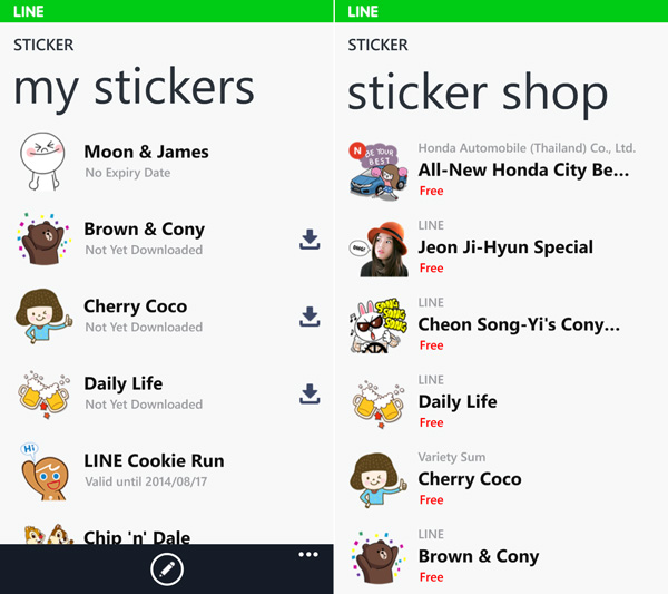 นอกจากนี้ LINE for Windows Phone นั้น ยังรองรับ สติ๊กเกอร์ ซึ่งถือว่า เป็นจุดขายสำคัญของ LINE เลยก็ว่าได้ครับ นอกจากนี้ ยังมี Sticker Shop ให้เลือกดาวน์โหลดสติ๊กเกอร์ลวดลายใหม่ๆ ได้อีกด้วย ส่วน Theme บน Windows Phone ยังไม่รองรับครับ
