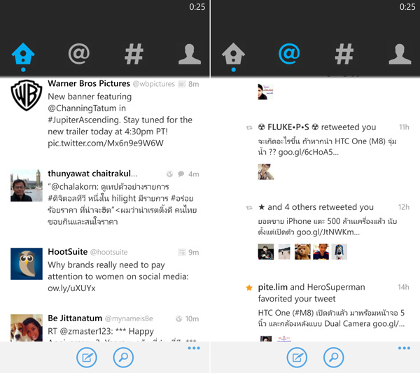 สำหรับ Twitter นั้น ถือว่า เป็น Social Network ที่ได้รับความนิยมมากพอๆ กับ Facebook เลยก็ว่าได้ครับ โดยมีอินเทอร์เฟส และการใช้งานที่ใกล้เคียงกับบน Android และ iOS นอกจากนี้ ยังรองรับการใช้งานภาษาไทยอย่างเต็มรูปแบบ อีกทั้งยังสามารถเพิ่มบัญชี Twitter ได้มากกว่า 1 บัญชี และสลับใช้งานได้อย่างง่ายดาย เรียกได้ว่าสะดวกมากทีเดียว