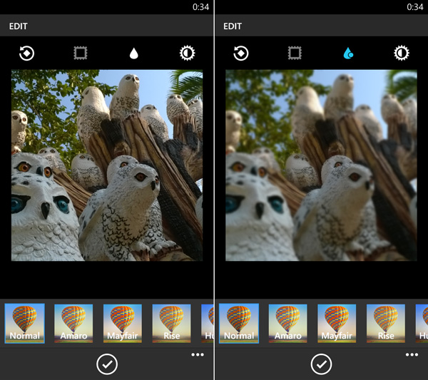 ส่วนการแชร์ภาพผ่านทาง Instagram นั้น สามารถทำได้ด้วยการ เลือกภาพที่มีอยู่บน Camera Roll หรือถ่ายภาพใหม่ จากนั้นให้ Crop ภาพให้พอดีกับกรอบที่ให้มา แล้วเลือกฟิลเตอร์ หรือทำเป็นภาพเบลอได้ตามใจชอบ จากนั้น กดแชร์ได้เลยทันที