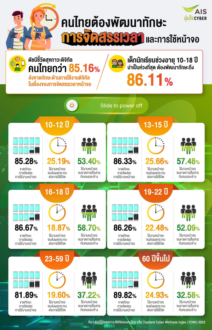 นางสายชล ทรัพย์มากอุดม หัวหน้าหน่วยธุรกิจประชาสัมพันธ์และงานธุรกิจสัมพันธ์ AIS กล่าวว่า “พฤติกรรมการใช้งานสื่อออนไลน์ของคนไทยยังคงใช้เวลาเพิ่มขึ้นในทุกปี จากรายงาน Global Overview Digital Report 2023 ของ We Are Social พบว่าคนไทยใช้เวลาอยู่บนโซเชียลมีเดีย เฉลี่ยวันละ 2 ชั่วโมง 44 นาที ประกอบกับผลดัชนีชี้วัดทักษะด้านดิจิทัลของคนไทย (TCWI) ยังพบอีกว่า กว่า 85.16% ยังขาดทักษะด้านการใช้งานดิจิทัล โดยเฉพาะในเรื่องของการจัดสรรเวลาหน้าจอ นอกจากนี้ยังพบอีกว่า โดยเฉพาะกลุ่มเด็กนักเรียนในวัย 10-18 ปี มีการใช้เวลาหน้าจอไม่ถูกต้องมากที่สุด และต้องได้รับการพัฒนาทักษะสูงถึง 86.11% ซึ่งพบว่าค่าเฉลี่ยของคะแนนจะต่ำสุดในช่วง 13-15 ปี เป็นช่วงแรกที่เด็กนักเรียนส่วนใหญ่จะเริ่มมีโทรศัพท์ของตนเอง ผลวิจัยยังพบอีกว่าการใช้หน้าจอมากเกินไปจนส่งผลกระทบต่อชีวิตประจำวัน เช่น การเรียน การทำงาน ถึง 23.59% และใช้งานหน้าจอเกือบตลอดเวลา ถึง 56.58% ซึ่งทักษะด้านการใช้งานดิจิทัล โดยเฉพาะในเรื่องของการจัดสรรเวลาหน้าจอเป็นหนึ่งในทักษะความฉลาดทางดิจิทัล 4P 4ป ที่เป็นการปลูกฝังการใช้งาน จากความเข้าใจพื้นฐานในการใช้สื่อออนไลน์อย่างเหมาะสม ไม่ว่าจะเป็นการจัดสรรเวลาในการใช้งาน หรือ การเลือกใช้เครื่องมือ