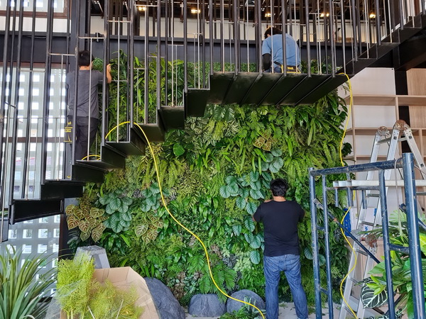 “ด้วยเทคโนโลยีการผลิต เราสามารถสร้างต้นไม้จากวัสดุรีไซเคิลให้เหมือนต้นไม้จริงนานาพันธุ์ได้ อย่างกล้วยด่าง มอนสเตอร่าด่าง บอนสี หรือต้นไม้อื่นๆ ที่ช่วงนี้กำลังฮิต ก็สามารถทำได้ แต่ต้นไม้เหล่านี้มีเอกลักษณ์เฉพาะ ตั้งแล้วมันจะสวยด้วยตัวของมันเอง พอต้องจัดรวมกันให้คุมธีม คุมภาพรวมในการออกแบบจะจัดยาก แต่ก็ขึ้นอยู่กับคอนเซ็ปต์ของงานที่ลูกค้าต้องการ หากสภาพแวดล้อมเอื้ออำนวย ในหลายๆ งานก็สามารถใช้ทั้งต้นไม้จริงและต้นไม้ปลอมเพื่อส่งเสริมกันและกันได้ด้วย”