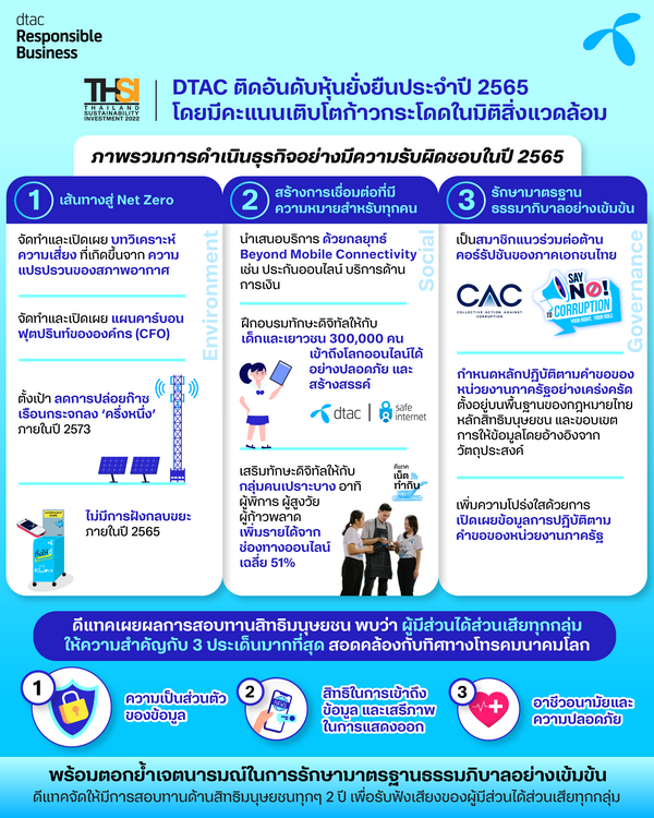 ดีแทคได้รับการคัดเลือกเข้าสู่รายชื่อหุ้นยั่งยืน (Thailand Sustainability Investment: THSI) ประจำปี 2565 จากตลาดหลักทรัพย์แห่งประเทศไทย ในฐานะบริษัทจดทะเบียนที่ดำเนินธุรกิจอย่างยั่งยืน โดยคำนึงถึงความรับผิดชอบต่อสิ่งแวดล้อม สังคม และบรรษัทภิบาล (Environment, Social and Governance: ESG) ในปีนี้ บริษัทมีคะแนนเติบโตก้าวกระโดดในมิติสิ่งแวดล้อม