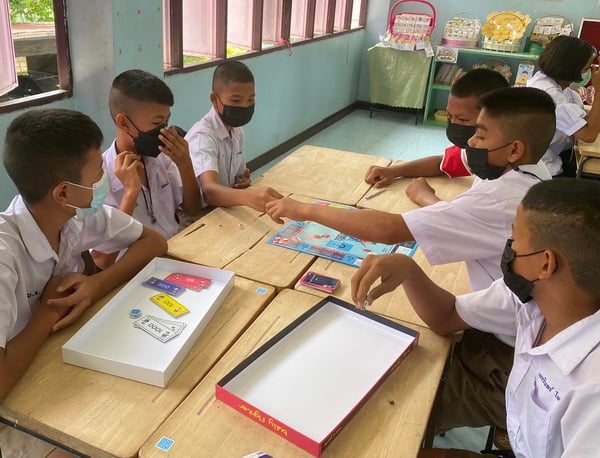 บรรยายภาพ 001-002 : นักเรียนจากโรงเรียนบ้านไดปลาดุกราษฎร์ศรัทธาทรงธรรม จ.พิจิตร กำลังเล่นบอร์ดเกม Bully Fighter เพื่อเรียนรู้และรับมือกับปัญหา Cyberbullying
