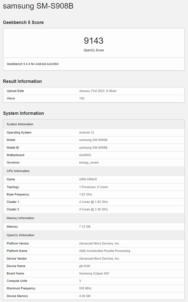 ผลการทดสอบแรกมาจาก Geekbench 5 โดยอุปกรณ์ Samsung SM-S908B ที่มี RAM 8GB และระบบปฏิบัติการ Android 12 สามารถทำคะแนนบนชุดทดสอบ OpenCL ได้สูงสุด 9143 คะแนน ในขณะที่ชิปเซ็ต Snapdragon 8 Gen 1 ทำคะแนนบนชุดทดสอบเดียวกันได้ 6199 คะแนนเท่านั้น