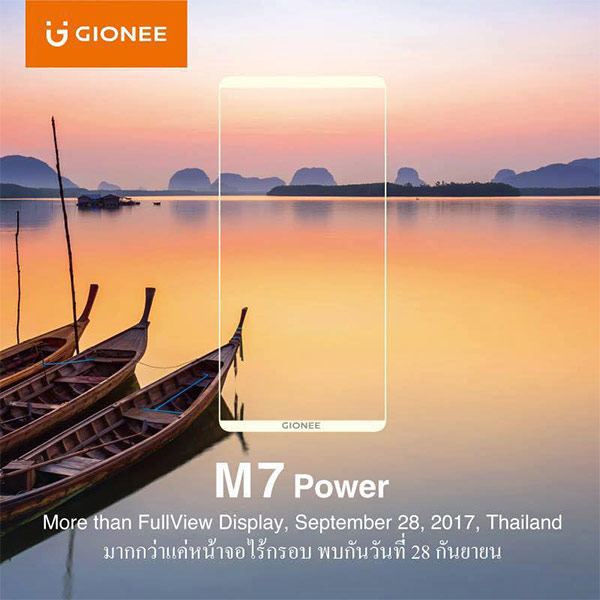 จากภาพทีเซอร์เผยให้เห็น Gionee M7 Power บนการดีไซน์หน้าจอไร้ขอบ ที่มีขอบพื้นที่ด้านบน-ล่างหน้าจอลดลง จึงทำให้มีพื้นที่การแสดงผลมากขึ้นบนตัวเครื่องขนาดเดิม และมีสโลแกน "More Than FullView Display มากกว่าแค่หน้าจอไร้ขอบ" พร้อมระบุไว้อย่างชัดเจนว่าจะเปิดตัวอย่างเป็นทางการในประเทศไทยวันที่ 28 กันยายนนี้ ภายในงาน Thailand Mobile Expo 2017