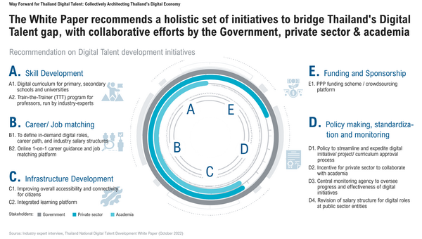 นอกจากนี้ สมุดปกขาว "การพัฒนาบุคลากรด้านดิจิทัลของประเทศไทย” ที่จัดทำร่วมกับ โรแลนด์ เบอร์เกอร์ (Roland Berger) บริษัทผู้ให้คำปรึกษาด้านการจัดการระดับโลก ได้ระบุถึงกรอบแนวคิดองค์รวม 5 ประการ เพื่อนำไปสู่การแก้ปัญหาความเหลื่อมล้ำด้านบุคลากรไอซีที โดยจะมาจากการผสานความร่วมมือระหว่างภาครัฐ ภาคเอกชน และสถาบันการศึกษา ประกอบด้วย 1) การจัดทำนโยบาย การปรับมาตรฐาน และการติดตามการดำเนินการ 2) การพัฒนาทักษะ 3) การสร้างอาชีพและการหางานเพื่อรองรับบุคลากร 4) การพัฒนาโครงสร้างพื้นฐาน และ 5) การระดมทุนและสนับสนุนเงินทุน