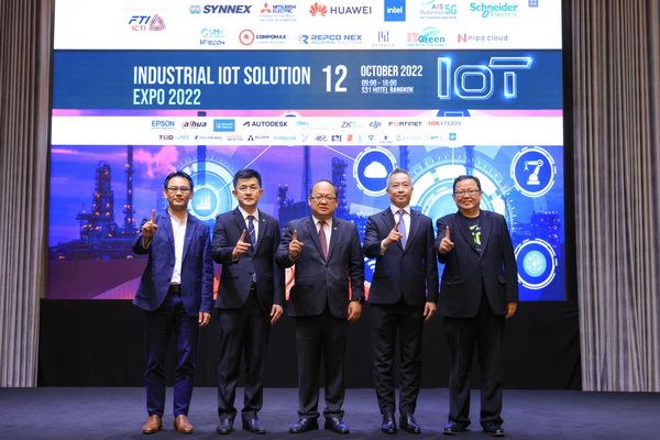 พิธีเปิดงาน Industrial IOT Solution EXPO 2022 นำโดย ดร.ชวพล จริยวิโรจน์ (ที่4จากซ้าย) กรรมการผู้จัดการ บริษัท หัวเว่ย เทคโนโลยี่ (ประเทศไทย) จำกัด และ นายเกรียงไกร เธียรนุกุล (ที่3จากซ้าย) ประธานสภาอุตสาหกรรมแห่งประเทศไทย