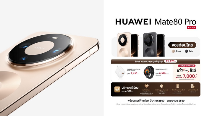HUAWEI Mate 80 Pro มีให้เลือก 2 สี ได้แก่ สีทอง และสีดำ เปิดให้สั่งจองล่วงหน้าระหว่างวันที่ 27 มีนาคม 2569 – 2 เมษายน 2569 พร้อมรับฟรี! ของสมนาคุณมูลค่าสูงสุด 21,470 บาท เฉพาะช่วงพรีออเดอร์ ได้แก่ HUAWEI SuperCharge 100W Adapter มูลค่า 2,490 บาท และ HUAWEI Watch GT5 มูลค่า 6,990 บาท (คละสี, มีจำนวนจำกัด) และฟรีบริการพรีเมียม มูลค่า 4,990 บาท ได้แก่ HUAWEI Care+ ประกันอุบัติเหตุ 1 ครั้ง และเปลี่ยนแบตเตอรี่ฟรีภายใน 1 ปี (เมื่อความคงเหลือต่ำกว่า 80% ของประสิทธิภาพเดิม), APAC Region Warranty การรับประกันในภูมิภาคเอเชีย-แปซิฟิก, สิทธิ์เปลี่ยนแบตเตอรี่ฟรี 1 ครั้ง ภายใน 3 ปี, บริการติดฟิล์มฟรี 4 ครั้ง ภายใน 2 ปี และข้อเสนอ TRADE UP OFFER เก่าแลกใหม่ รับส่วนลดเพิ่มทันที 7,000 บาท สามารถสั่งจองได้ผ่านหน้าร้าน HUAWEI Experience Store ร้านค้าตัวแทนจำหน่ายที่ร่วมรายการ และช่องทางออนไลน์อย่าง HUAWEI Store, Lazada, Shopee และ TikTok Shop