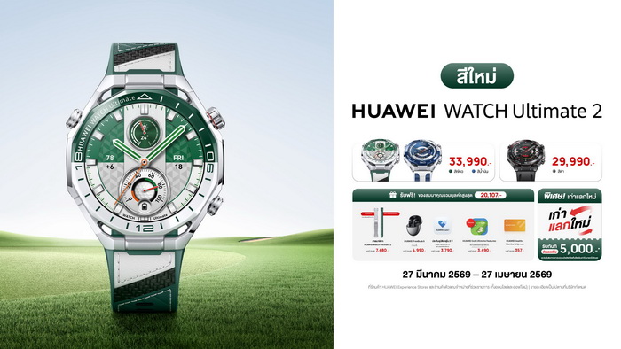 HUAWEI WATCH Ultimate 2 วางจำหน่ายในสีเขียว (สีใหม่) และสีน้ำเงิน ในราคา 33,990 บาท ส่วนสีดำ ราคา 29,990 บาท พิเศษเมื่อสั่งซื้อระหว่างวันที่ 27 มีนาคม 2569 – 27 เมษายน 2569 รับฟรี! ของสมนาคุณรวมมูลค่าสูงสุด 20,107 บาท ได้แก่ สายนาฬิกา HUAWEI Watch Ultimate 2 มูลค่าสูงสุด 7,480 บาท, HUAWEI FreeBuds 5 (เฉพาะรุ่นที่กำหนด) มูลค่าสูงสุด 4,990 บาท, ประกันอุบัติเหตุ 2 ปี HUAWEI Care+ มูลค่าสูงสุด 3,790 บาท, HUAWEI Golf Ultimate Features (เปิดใช้งานฟรีตลอดชีพ) มูลค่าสูงสุด 3,490 บาท และ HUAWEI Health+ Membership มูลค่าสูงสุด 357 บาท พร้อมข้อเสนอพิเศษ เก่าแลกใหม่ รับส่วนลดเพิ่มทันที 5,000 บาท สามารถสั่งซื้อได้ที่หน้าร้าน HUAWEI Experience Store ร้านค้าตัวแทนจำหน่ายที่ร่วมรายการ และช่องทางออนไลน์ HUAWEI Store, Lazada, Shopee และ TikTok Shop