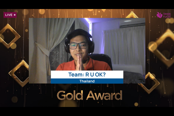 ในภาพ - นายฐิติพงศ์ ภาวะดี (ซ้ายสุด), นายอชิตพล วุฒิปัญญารัตนกุล (ที่ 2 จากซ้าย), นายคริษฐ์ สุขปรีดี (ที่ 3 จากซ้าย), น.ส.ชนิศา โพธิ์พะเนาว์ (ที่ 4 จากซ้าย), นายกรดนัย เอี่ยมชีรางกูร (ที่ 4 จากขวา), น.ส.พัชรินทร์ บุญสมเชื้อ (ที่ 3 จากขวา), นายพริษฐ์ จงหาญ (ที่ 2 จากขวา) และ น.ส.ชวัลลักษณ์ เจริญศิริ (ขวาสุด) สมาชิกจากทีม Are u OK? ตัวแทนประเทศไทย
