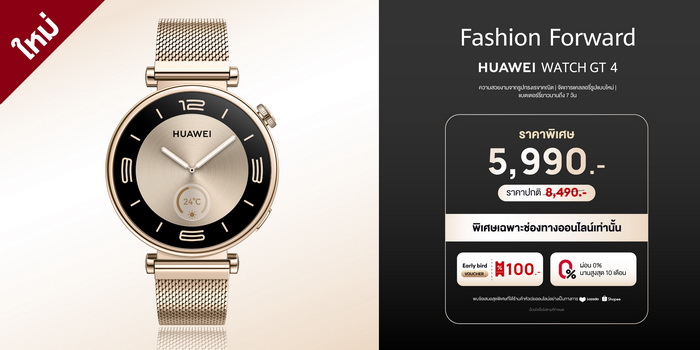 HUAWEI WATCH GT 4 สีใหม่ Light Gold Edition วางจำหน่ายช่องทางออนไลน์ราคาพิเศษ 5,990 บาท[2] จากราคาปกติ 8,990 บาท พร้อมคูปอง Early bird มูลค่า 100 บาท และโปรบัตรเครดิตที่ร่วมรายการผ่อน 0% สูงสุด 10 เดือน สำหรับช่องทาง Huawei Store ร้านค้าอย่างเป็นทางการของหัวเว่ยบน Lazada และ Shopee