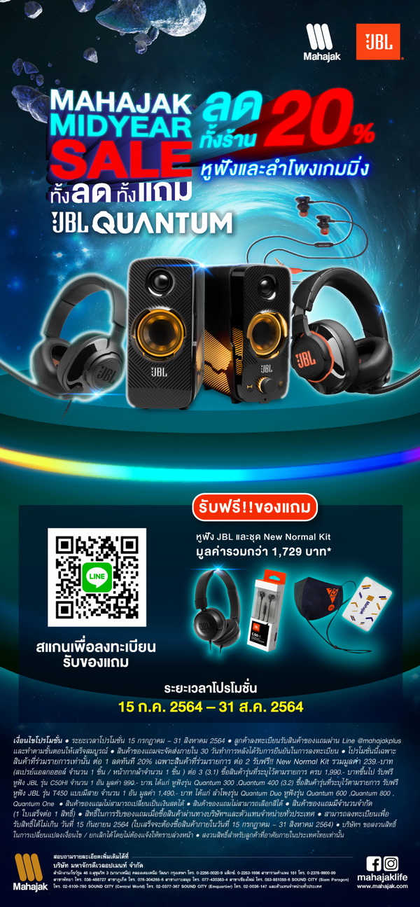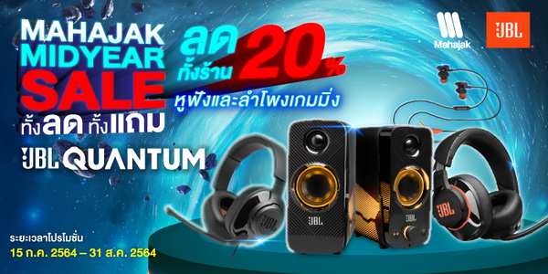 โค้งสุดท้าย MAHAJAK MID YEAR SALE 2021 ลดหนักลดแรงทุกรุ่น สินค้าหูฟังและลำโพงเกมมิ่ง JBL Quantum พร้อมรับทันทีของแถมสุดพิเศษ!!
