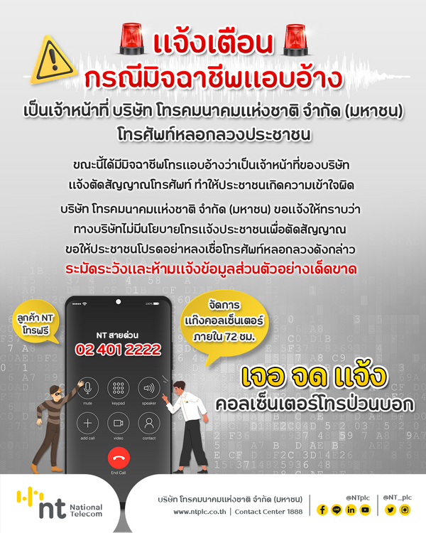 นางสาวโชติกา ไพจ์ศรี ผู้จัดการฝ่ายประชาสัมพันธ์และสื่อสารองค์กร บริษัท โทรคมนาคมแห่งชาติ จำกัด (มหาชน) หรือ NT เปิดเผยว่า ขณะนี้แก๊งคอลเซ็นเตอร์กำลังระบาดหนักทั้งช่องทางออนไลน์และการโทรมาแอบอ้างในลักษณะต่างๆ ล่าสุดได้เปิดกลลวงใหม่ โดยอ้างตัวเป็นเจ้าหน้าที่ NT แจ้งจะระงับสัญญาณโทรศัพท์ NT จึงขอแจ้งให้ทราบว่า บริษัทไม่มีนโยบายโทรแจ้งเพื่อตัดสัญญาณโทรศัพท์แต่อย่างใด และขอให้ประชาชนอย่าหลงเชื่อและห้ามแจ้งข้อมูลส่วนตัวโดยเด็ดขาด ซึ่งกรณีที่ผู้ใช้บริการของ NT เจอมิจฉาชีพหลอกลวงในลักษณะดังกล่าว สามารถโทรแจ้งได้ที่สายด่วน NT 02 401 2222 (ผู้ใช้บริการ NT ไม่มีค่าใช้จ่าย) NT จะดำเนินการตรวจสอบและระงับการโทรจากหมายเลขต้นทาง พร้อมแจ้งไปยังโครงข่ายประเทศต้นทางให้ระงับหมายเลขของมิจฉาชีพภายใน 72 ชั่วโมง