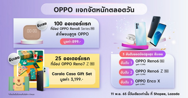 เริ่มด้วยดีลสุดว้าว Midnight Deals เที่ยงคืน-ตีสอง วันที่ 11 พฤศจิกายน 2565 ช้อปดีลเด็ด รับเลย! ของสมนาคุณสุดคุ้ม ที่ OPPO Official Store บน Shopee และ Lazada เท่านั้น