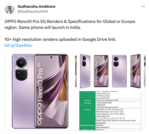 Sudhanshu Ambhore แหล่งข่าวหลุดชื่อดังจากอินเดีย ได้เปิดเผยสเปกชีตพร้อมภาพเรนเดอร์คุณภาพสูงของ OPPO Reno10 Pro 5G เวอร์ชัน Global ซึ่งแตกต่างจากสเปกของเวอร์ชันที่ขายในจีนหลายจุด เริ่มจากชิปเซ็ต Snapdragon 778G ที่มาแทนที่ Dimensity 8200 ซึ่งจะทำให้ประสิทธิภาพลดลงพอสมควร เพราะชิป Snapdragon 778G ค่อนข้างจะเป็นเทคโนโลยีที่เก่าแล้ว