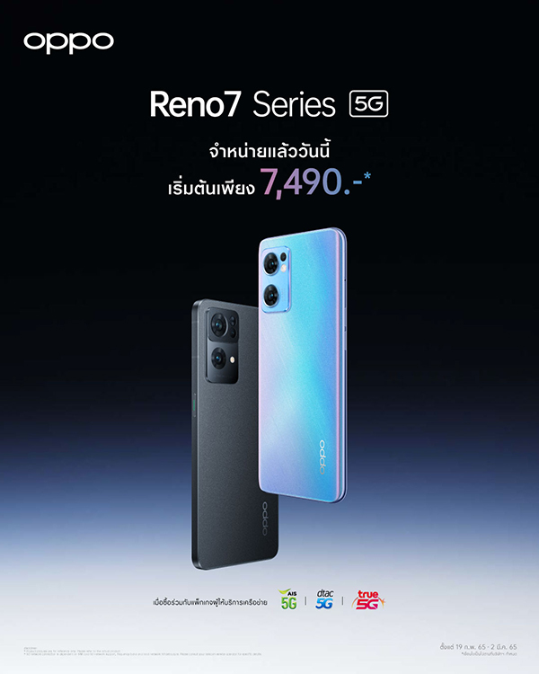 หรือสามารถเป็นเจ้าของได้ง่ายมากขึ้นเมื่อซื้อ OPPO Reno7 5G และ Reno7 Pro 5G ผ่านผู้ให้บริการเครือข่าย ในราคาเริ่มต้นเพียง 7,490 บาท ตั้งแต่วันนี้ ถึงวันที่ 2 มีนาคม 2565 (เงื่อนไขเป็นไปตามที่บริษัทฯ กำหนด)