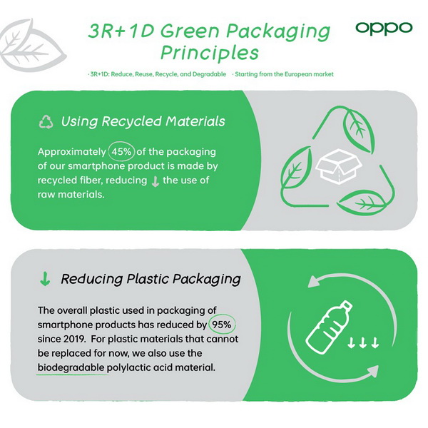- OPPO มุ่งมั่นที่จะนำหลักการบรรจุภัณฑ์เพื่อความยั่งยืน “3R+1D” ซึ่งเป็นที่ยอมรับในระดับสากลมาใช้ในการลดน้ำหนักของบรรจุภัณฑ์ การนำวัสดุรีไซเคิลมาใช้ใหม่ และการใช้วัสดุที่สามารถรีไซเคิลและย่อยสลายได้ตามธรรมชาติในบรรจุภัณฑ์ เริ่มจากตลาดในยุโรปในปี 2564 OPPO ประสบความสำเร็จในการลดจำนวนบรรจุภัณฑ์ที่ใช้สำหรับผลิตภัณฑ์สมาร์ทโฟนลงถึง 24% เมื่อเทียบกับปี 2019 โดยบรรจุภัณฑ์ประมาณ 45% ทำจากเส้นใยรีไซเคิล และพลาสติก โดยทำให้ยอดการใช้พลาสติกโดยรวมของบรรจุภัณฑ์ผลิตภัณฑ์สมาร์ทโฟนลดลงถึง 95% ตั้งแต่ปี 2019 และสำหรับวัสดุพลาสติกที่ไม่สามารถทดแทนได้ในขณะนี้ OPPO เลือกใช้วัสดุพลาสติกชีวภาพที่สามารถย่อยสลายได้ตามธรรมชาติ นอกจากนี้ บรรจุภัณฑ์ของสมาร์ทโฟนประมาณ 45% ทำมากจากเส้นใยรีไซเคิล ซึ่งช่วยลดการใช้วัตถุดิบได้