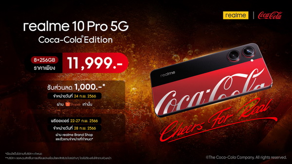 สำหรับใครที่อยากเป็นเจ้าของก็ต้องรีบจับจอง! realme 10 Pro 5G Coca-Cola Edition ความจุ 8+256GB มาในราคา 11,999 บาท โดยสามารถเป็นเจ้าของได้ก่อนใครผ่านช่องทางออนไลน์ ซึ่ง exclusive เฉพาะช่องทาง Shopee ในวันที่ 24 กุมภาพันธ์ นอกจากนี้สำหรับ 100 ออเดอร์แรกจะได้รับส่วนลดสูงสุด 1,000 บาท และสำหรับช่องทาง realme brand shop และตัวแทนจำหน่ายที่กำหนด เปิดให้พรีออเดอร์ได้ตั้งแต่วันที่ 22 กุมภาพันธ์ – 27 กุมภาพันธ์ และจำหน่ายพร้อมกันในวันที่ 28 กุมภาพันธ์เป็นต้นไป