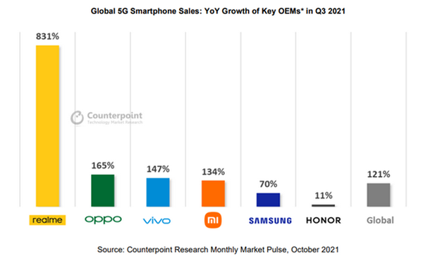 realme (เรียลมี) ถูกขนานนามว่าเป็น "ผู้กระจายเครือข่าย 5G ระดับโลก" ผู้ทุ่มเทให้กับการทำให้สมาร์ตโฟน 5G ให้มวลชนสามารถเข้าถึงได้ ด้วยการลงทุนด้านการวิจัย และการพัฒนาที่แข็งแกร่ง รวมไปถึงผลิตภัณฑ์ที่หลากหลาย ตลอดจนข้อมูลเชิงลึกของผู้ใช้ ในระยะเวลาสามปี realme สามารถก้าวขึ้นสู่อันดับที่สามของการจัดอันดับแบรนด์สมาร์ตโฟน 5G ในตลาดเกิดใหม่ โดยมีส่วนแบ่งสูงถึง 15.5% ในไตรมาสที่ 2 ปี 2564 ตามที่แสดงในผลการวิจัยของ Counterpoint Research ในเดือนกันยายน