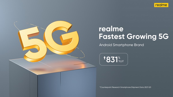 กรุงเทพฯ 7 มกราคม 2565 - realme (เรียลมี) ผู้ผลิตสมาร์ตโฟนแอนดรอยด์รายใหญ่อันดับที่ 5 ของโลกยังคงเติบโตอย่างแข็งแกร่งในกลุ่มสมาร์ตโฟน 5G อันเนื่องมาจากข้อมูลล่าสุดที่ได้เปิดเผยจาก บริษัทวิเคราะห์ตลาด Counterpoint Research ว่า realme นั้นเป็นแบรนด์สมาร์ตโฟน 5G ประเภท Androids ที่เติบโตขึ้นอย่างรวดเร็วที่สุดในโลกในช่วงไตรมาสที่ 3 โดยมีการเติบโตอย่างแข็งแกร่ง ในประเทศอินเดีย, จีน, และยุโรป realme สามารถเติบโตได้ไกลในตลาดด้วยยอดขายสมาร์ตโฟน 5G ที่เติบโตขึ้น 831% ต่อปี เปรียบเทียบกับอัตราการเติบโตทั่วโลกที่ 121%