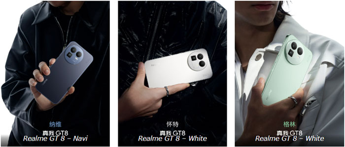 realme GT 8 จะมีให้เลือกทั้งหมด 3 สี ได้แก่ Navi, White และ Green