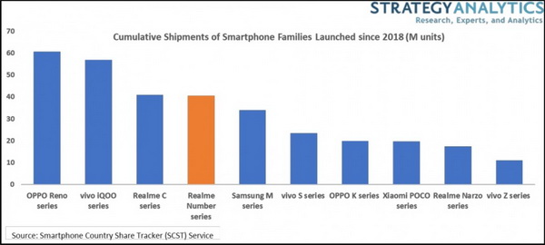 Strategy Analytics บริษัทนักวิเคราะห์ข้อมูลชื่อดัง ระบุว่าสมาร์ตโฟนในกลุ่ม Number Series ของ realme อยู่ในอันดับที่ 4 ในไตรมาสที่ 3 ของปี 2564 จากการส่งมอบสมาร์ตโฟนท่ามกลาง "ตระกูลสมาร์ตโฟนยุคใหม่” ซึ่งมีความสำคัญต่อการขยายการเติบโตของแบรนด์ได้เร็วที่สุดเท่าที่เคยมีมาของการส่งมอบสมาร์ตโฟน 100 ล้านเครื่องในประวัติการณ์ของสมาร์ตโฟนทั้งหมด สำหรับ "ตระกูลสมาร์ตโฟนยุคใหม่" คือกลุ่มผลิตภัณฑ์สมาร์ตโฟนที่เปิดตัวตั้งแต่ปี 2561 ได้แก่ Reno จาก OPPO, iQoo จาก vivo และ Galaxy M จาก Samsung