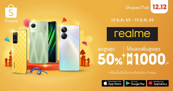 ยิ่งไปกว่านั้น เรียลมี (realme) ยังเตรียมเฉลิมฉลองเทศกาลแห่งความสุขและวันเกิดของช้อปปี้ ในแคมเปญ ‘realme Golden 12.12’ ซึ่งเป็นส่วนหนึ่งของมหกรรม ‘Shopee 12.12 ลดใหญ่วันเกิด’ ด้วยการส่งโปรโมชั่นและของแถมสุดพิเศษมากมาย ทั้งส่วนลด 50%[7] และโค้ดลดเพิ่ม 1,000 บาท[8] ในระหว่างวันที่ 12 - 15 ธันวาคม 2565 นอกจากนี้ยังมีโค้ดลับสุดคุ้มมากมายใน Shopee Live ตั้งแต่เวลา 20.00 - 21.00 น. ของวันที่ 10 ธันวาคม และในเวลา 21.00 - 22.00 น. ของวันที่ 11 และวันที่ 12 ธันวาคม 2565 พร้อมทั้งสามารถรับสิทธิประโยชน์เพิ่มเติมอีกมากมายเมื่อชำระผ่าน ShopeePay หรือเลือกผ่อนชำระง่ายๆ แบบไม่ใช้บัตรด้วย SPayLater หรือร่วมผ่อนชำระ 0% นานสูงสุด 10 เดือน[9] กับบัตรเครดิตที่ร่วมรายการ