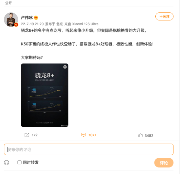 Lu weibing ผู้จัดการทั่วไปของ Xiaomi ได้ออกมาเปิดเผยข้อมูลให้ทราบผ่านทางสื่อสังคมออนไลน์ในประเทศจีนอย่าง Weibo โดยระบุให้ทราบว่า Redmi K50 มือถือเรือธงรุ่นใหม่กำลังอยู่ในกระบวนการพัฒนา และจะมาพร้อมกับชิปเซ็ตจากค่าย Qualcomm รุ่นใหม่ล่าสุดอย่าง Snapdragon 8+ Gen 1 ด้วย โดยคาดว่าน่าจะเป็นการเปิดตัวรุ่นใหม่ที่รีแบรนด์ในชื่อ Redmi K50S และ K50S Pro โดยในรุ่น Redmi K50S น่าจะมาพร้อมกับชิปเซ็ต MediaTek Dimensity 8100 ส่วนทางด้านรุ่น K50S Pro จะเป็นรุ่นที่ได้ใช้ชิปเซ็ตตัวแรงรุ่นอัปเกรดจาก Qualcomm โดยคาดว่าจะมีการเปิดตัวให้เห็นภายในช่วงเดือนสิงหาคมที่กำลังจะถึงนี้