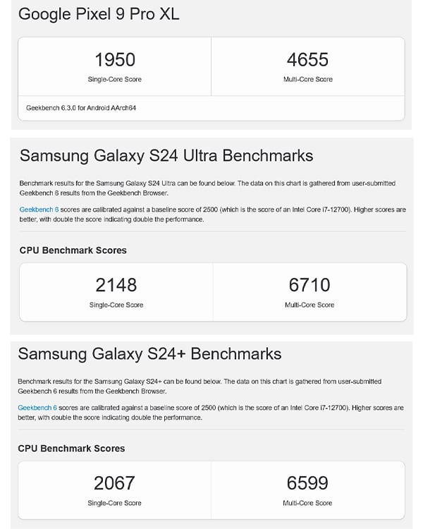 ในการทดสอบ GeekBench 6 พบว่า Pixel 9 Pro XL ทำคะแนนได้ 1,950 คะแนนในการทดสอบแบบ single-core และ 4,655 คะแนนในการทดสอบแบบ multi-core ในขณะที่ Galaxy S24 Ultra ที่ใช้ Snapdragon 8 Gen 3 for Galaxy ทำได้ 2,148 คะแนนในการทดสอบแบบ single-core และ 6,710 คะแนนในการทดสอบแบบ multi-core ส่วน Galaxy S24+ ที่ใช้ Exynos 2400 ทำได้ 2,067 คะแนนในการทดสอบแบบ single-core และ 6,599 คะแนนในการทดสอบแบบ multi-core