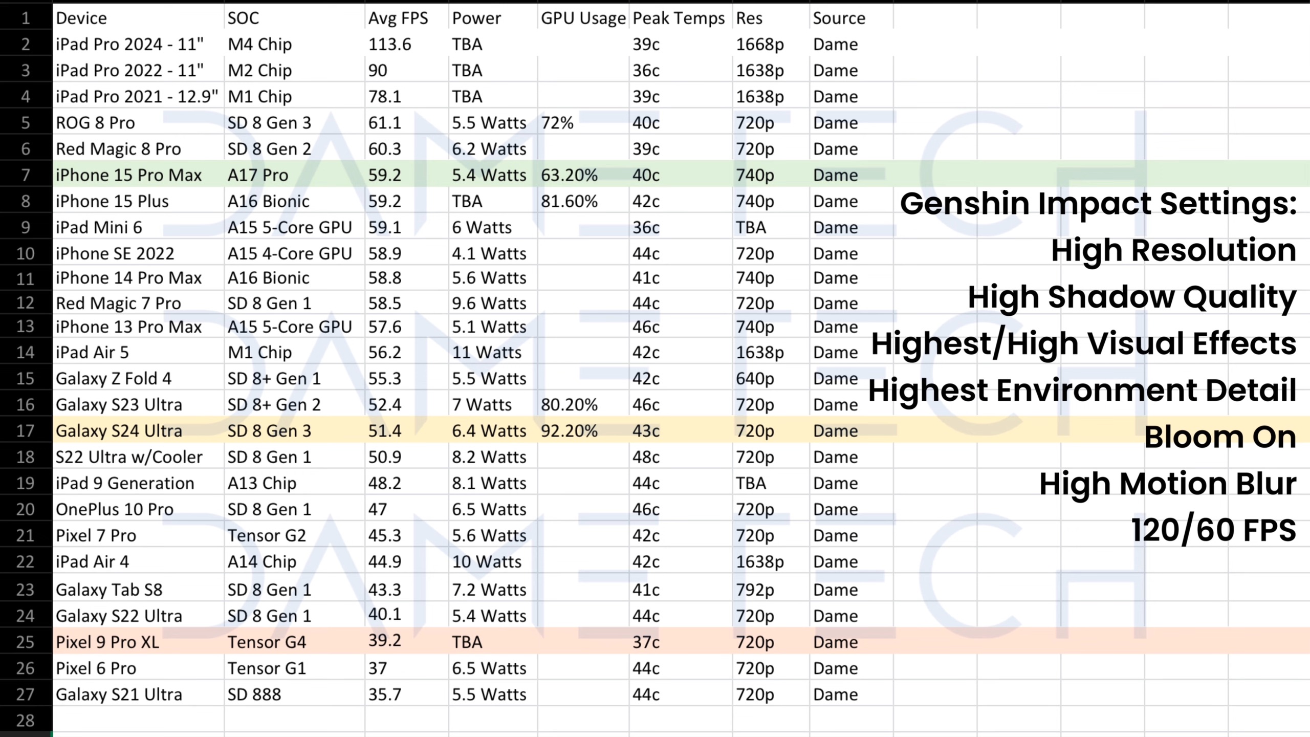 ในการทดสอบด้วยเกม Genshin Impact ผลปรากฎว่า Pixel 9 Pro XL ทำได้ 39.2 fps ในขณะที่ Galaxy S24 Ultra ทำได้ 51 fps นั่นหมายความว่า GPU ของ Samsung มีประสิทธิภาพดีกว่า Google ถึง 30%