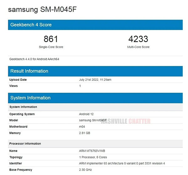 เมื่ออาทิตย์ก่อนมีข่าวสมาร์ทโฟนรุ่นประหยัด Samsung Galaxy A04 ได้ผ่านการรับรองจาก กสทช. เป็นที่เรียบร้อย คราวนี้ถึงคิวของ Galaxy M Series เพราะล่าสุดมีตาดีพบข้อมูลสมาร์ทโฟนเลขรหัส SM-M045F ซึ่งคาดว่าอาจเป็นรุ่น Galaxy M04 โผล่บนฐานข้อมูลของ Geekbench โดยมีสเปกคร่าว ๆ หลุดออกมาให้ทราบบ้างแล้ว