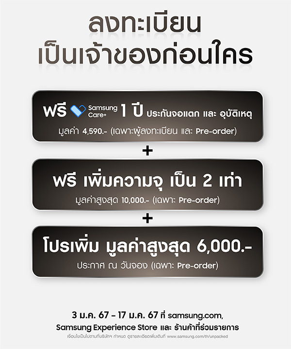 จนล่าสุดทาง Samsung (ประเทศไทย) ก็ได้ฤกษ์เปิดให้ลงทะเบียนแสดงความสนใจล่วงหน้าแล้วตั้งแต่วันที่ 3 มกราคม 2567 เวลา 6.00 น. ไปจนถึงวันที่ 17 มกราคม 2567 เวลา 23.59 น. โดยผู้ที่ลงทะเบียนจะได้รับโค้ดสิทธิพิเศษเพื่อที่จะได้รับเครื่องมาใช้งานก่อนใครในช่วงวันที่ 26-30 มกราคม 2567 (วางจำหน่ายจริงวันที่ 31 มกราคม 2567) พร้อมรับสิทธิพิเศษฟรี 3 ต่อ รวมมูลค่าสูงสุดถึง 20,590 บาทดังนี้