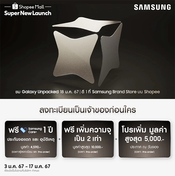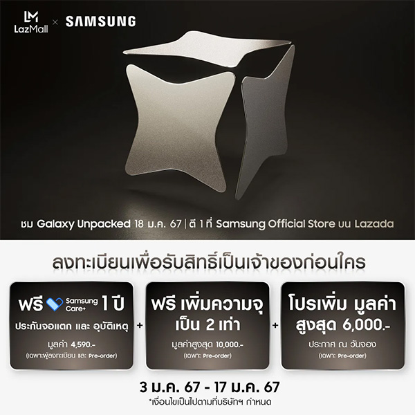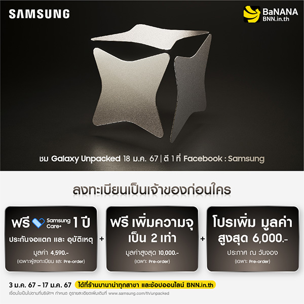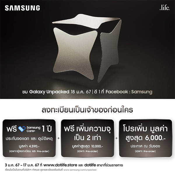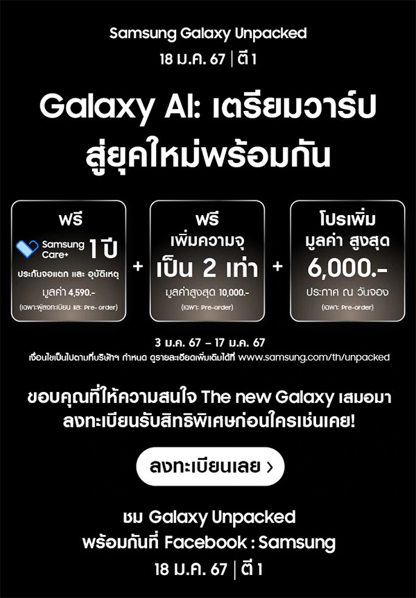 1. ลูกค้าที่ลงทะเบียนแสดงความสนใจจะซื้อ The new Galaxy ระหว่างวันที่ 3 ม.ค. 67 เวลา 06.00 น. ถึง 17 ม.ค. 67 เวลา 23.59 น. ผ่านทางเว็บไซต์ https://www.samsung.com/th/unpacked จะได้รับโค้ดผ่านทางอีเมลที่ลูกค้าลงทะเบียนไว้ เพื่อใช้ในการจองซื้อ The new Galaxy พร้อมรับสิทธิพิเศษรับเครื่องก่อนใคร ทั้งนี้ สิทธิ์การรับเครื่องก่อนใคร มีจำนวนจำกัด